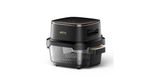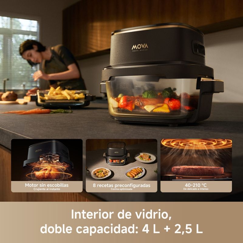 Doble capacidad flexible 4 L + 2,5 L. Alterna entre un tazón de 4 L para comidas familiares y otro de 2,5 L para porciones rápidas y crujientes. Ambos con asas y base aislada para llevar directo a la mesa. Incluye lunchera de vidrio con tapa.