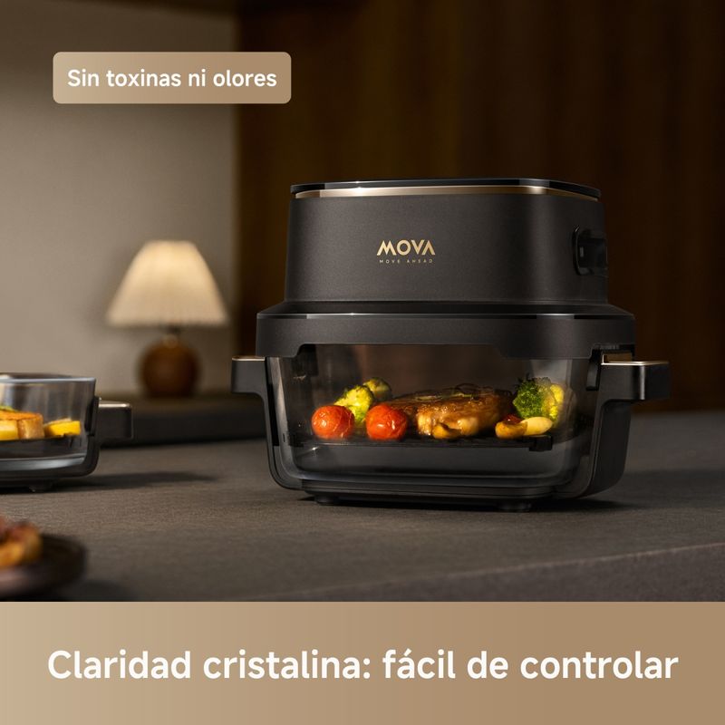 Interior 100% vidrio, visible y sin olores. Observa la cocción en tiempo real sin levantar tapa ni perder calor; material resistente que evita liberación de químicos u olores. Incluye reja metálica para proteger del elemento calefactor.